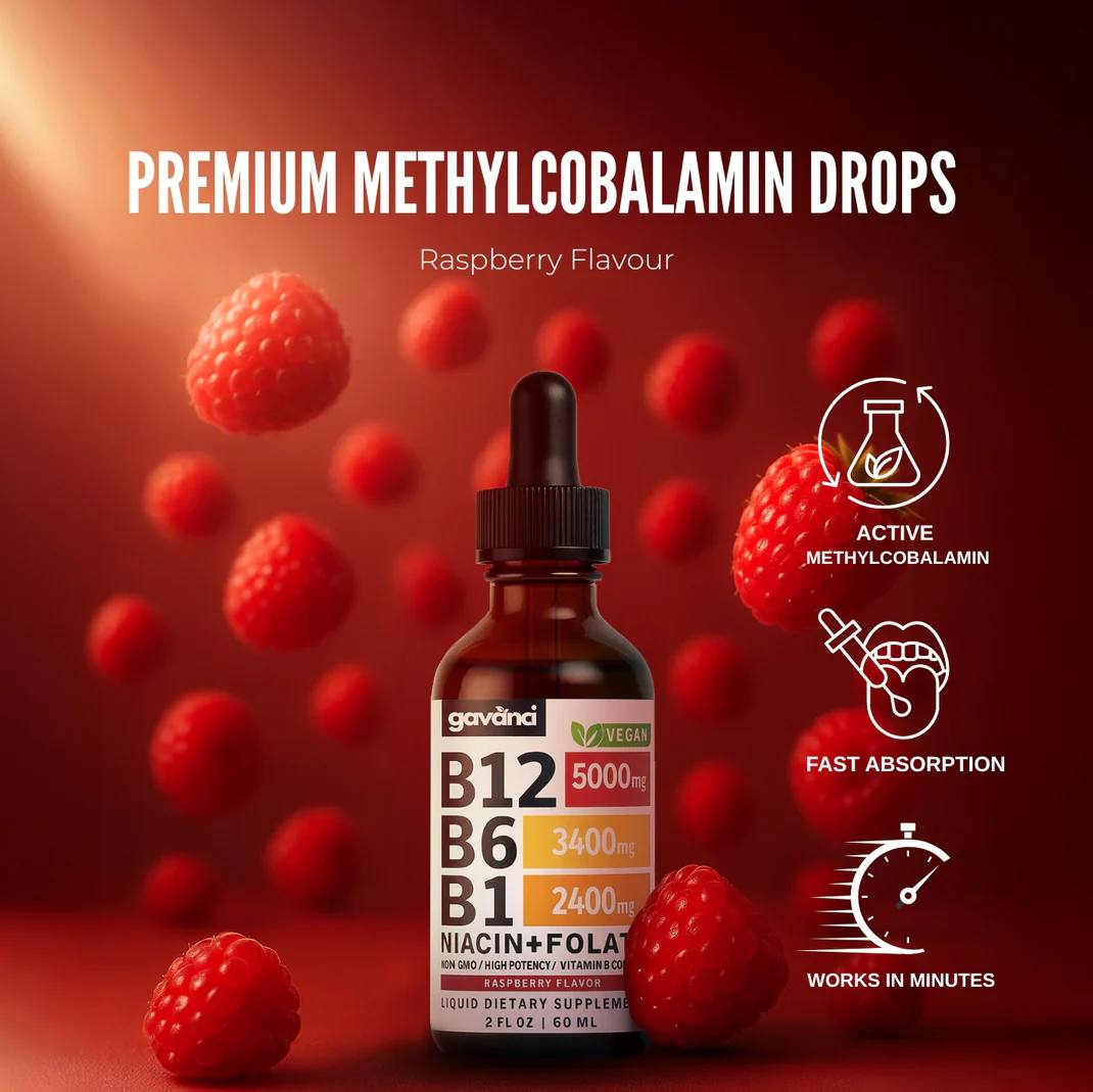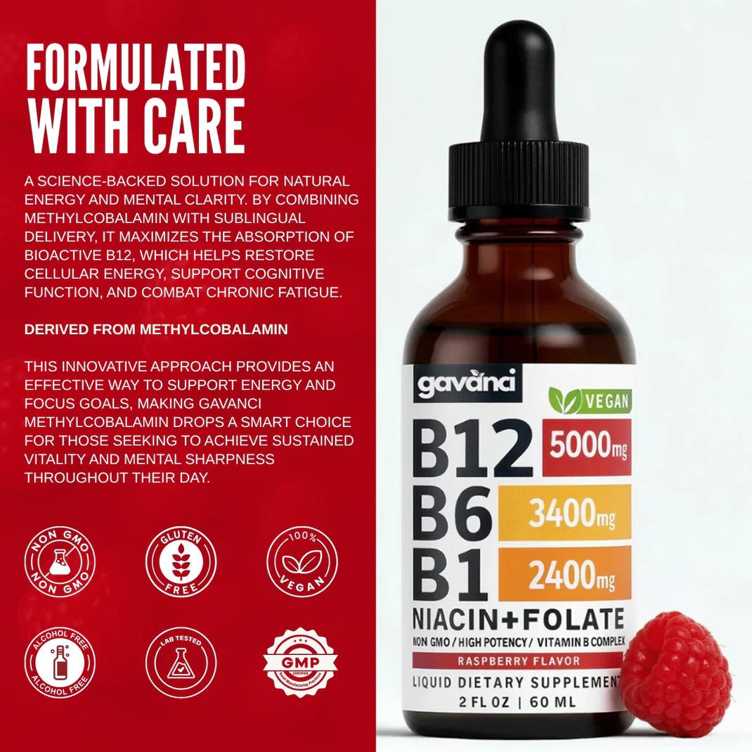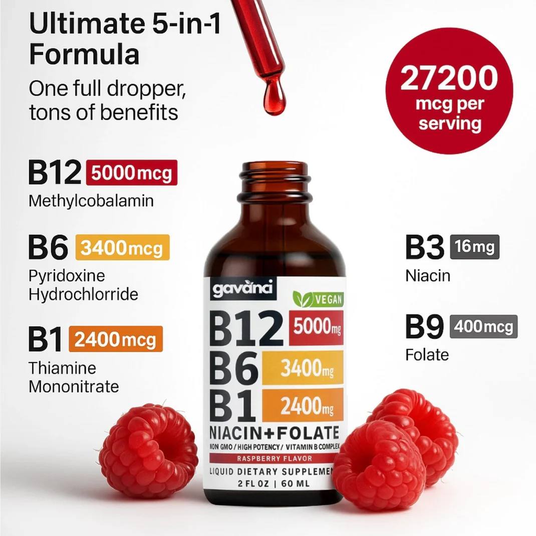 Boost your daily health with our Vitamin B12 Liquid Drops,a fast-absorbing blend of B12, B6, B1, Niacin, and Folate in a tasty raspberry flavor. Supports energy, focus, and overall vitality.